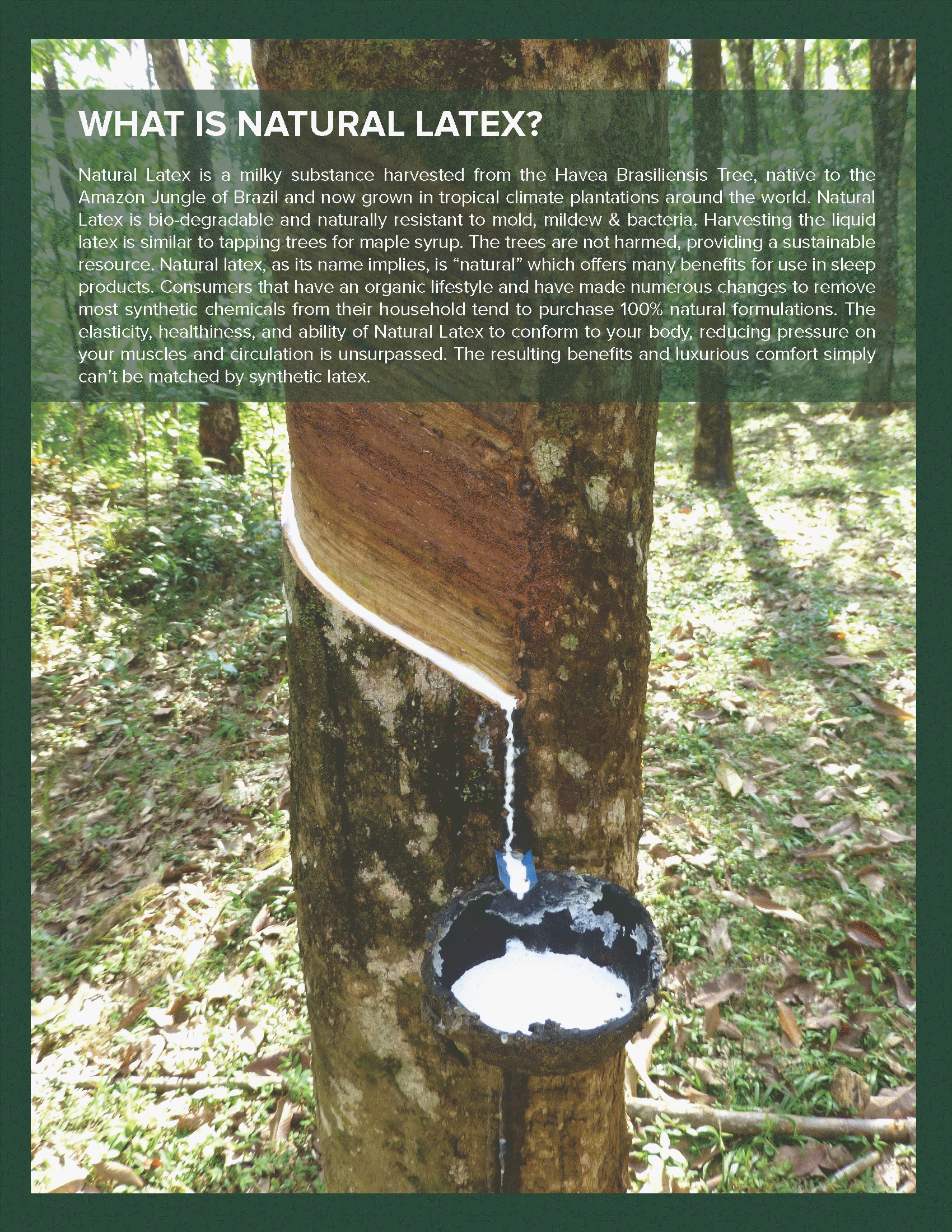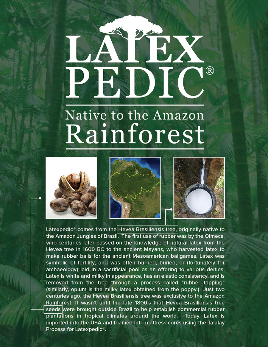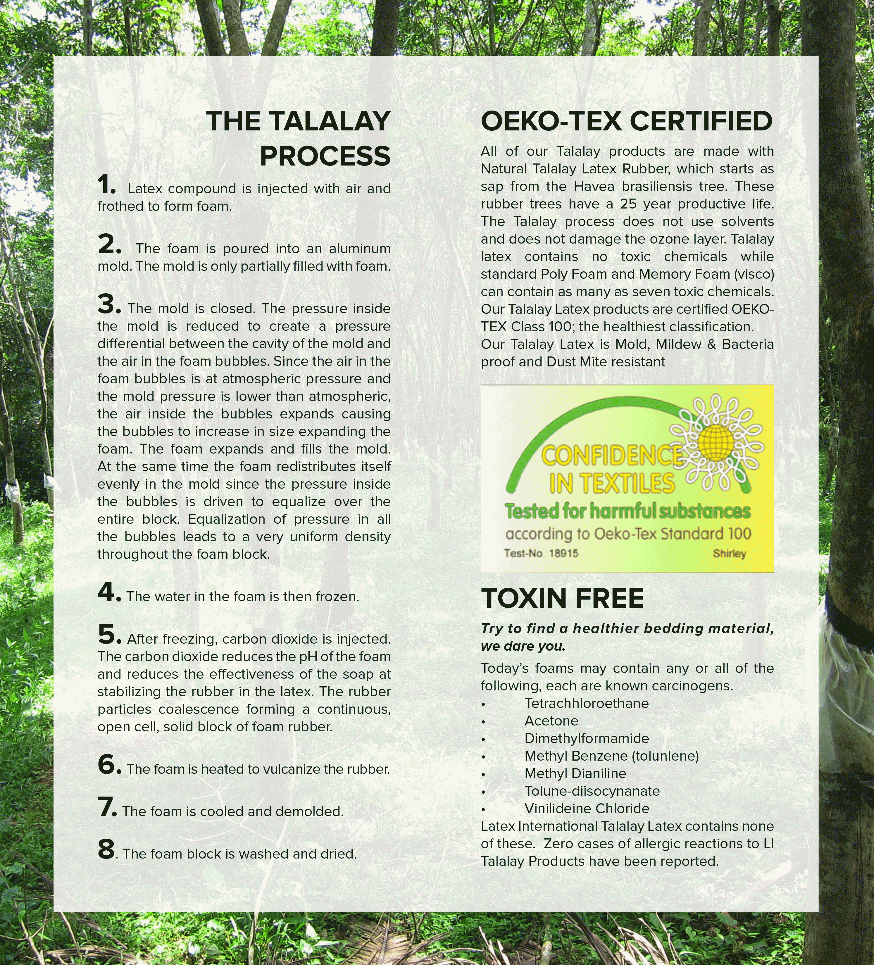 LATEX INTERNATIONAL TALALAY - ENVIRONMENTALLY CONSCIOUSAll of our Talalay products are made with Natural Talalay Latex Rubber, which starts as sap from the Havea brasiliensis tree. These rubber trees have a 25 year productive life and a strong positive effect on the environment as they quickly absorb carbon dioxide from the atmosphere and help reduce greenhouse emissions. Our Talalay process features natural, biodegradable ingredients that come from renewable resources and water-based raw materials: natural latex, air, and water. Our process does not use solvents and does not damage the ozone layer. Our clean and green approach carries through to our end products: Talalay latex contains no toxic chemicals while standard Poly Foam and Memory Foam (visco) can contain as many as seven toxic chemicals* |